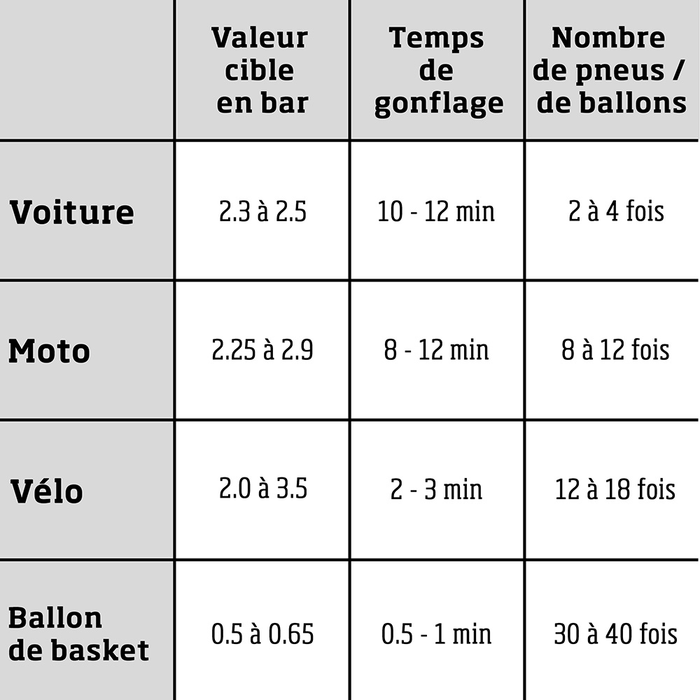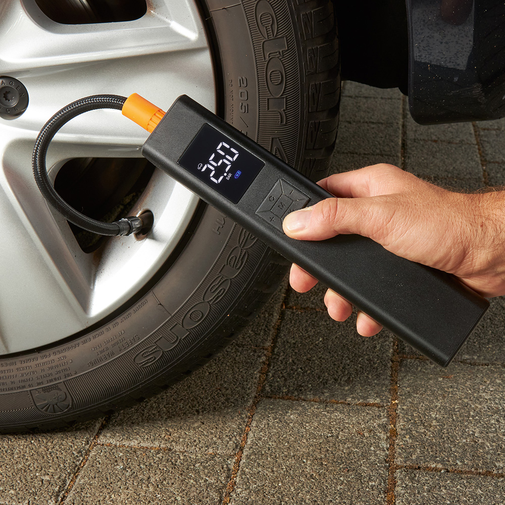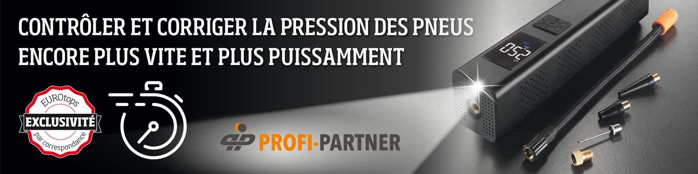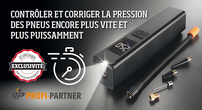 Un des meilleurs ! Le COMPRESSEUR D'AIR SANS FIL RECHARGEABLE en aluminium robuste gonfle les pneus encore plus vite exactement à la pression souhaitée. Sa pièce maîtresse est un moteur nouvellement conçu de 120 W au lieu des 80 W ordinaires. Le débit d'air ainsi généré est de 22 l/min, donc 50 % de plus que les autres modèles. L'énergie nécessaire est fournie par la batterie li-ion performante de 6.000 mAh, une valeur également optimale. Et le maniement ? Il est encore plus aisé car le compresseur se manipule d'une seule main et dispose d'un écran grand format à affichage LED clair et lisible. Saisissez la pression souhaitée ou recourez aux symboles préréglés (auto, moto, vélo, ballon, saisie libre) et à leur valeur de référence - puis mettez l'appareil en marche - c'est tout. Une fois la pression souhaitée atteinte, le compresseur s'arrête automatiquement. Rechargeable par connexion USB-C moderne ou par la prise 12 V de la voiture. Dimensions (L x l x H) : env. 23 x 5 x 5 cm. Poids env. 600 g. Malgré toutes ces améliorations, la pompe a gardé sa forme compacte et peut être facilement rangée en tout endroit. Pour votre prochain voyage, prenez la route plus vite et plus sûrement !