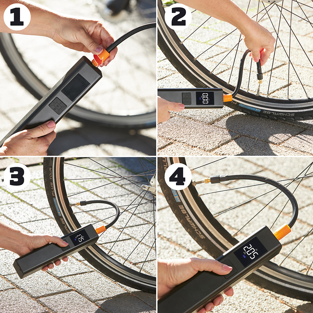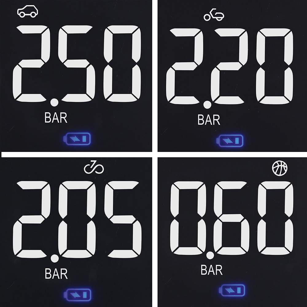 Saisie numérique de la valeur cible par paliers de 0.05 et arrêt automatique Écran LC rétroéclairé (diagonale d’écran de 5,5 cm) 4 adaptateurs pour tous les types de valves 4 unités de pression au choix (PSI, BAR, KPA, KG/CM2) 4 modes préréglés plus saisie libre de la valeur cible Boîtier aluminium avec connecteur de charge USB-C et 12 V (câble inclus) Longueur du tuyau en cm : env. 26