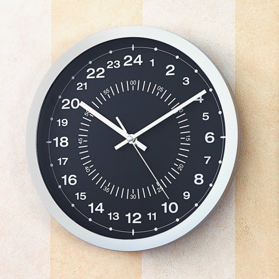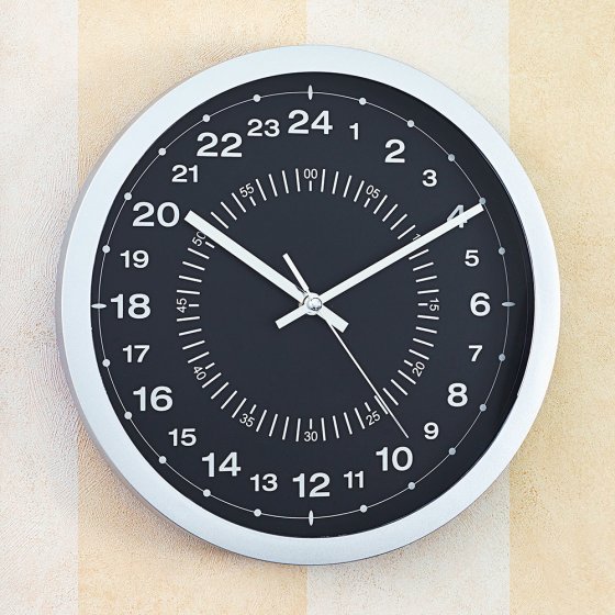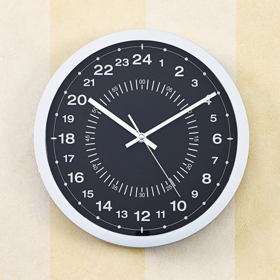 24-uursklokken hangen normaal gesproken alleen in schuilkelders of poolonderzoekstations - in ruimtes waar je niet gewoon uit het raam kunt kijken om te kijken of het donker of licht is. Dit maakt een 24-UURSWANDKLOK in de woonkamer of keuken des te extravaganter! Trakteer uzelf op een even opvallende als informatieve klok die niet iedereen zomaar heeft. De contrastrijke zwarte wijzerplaat met witte cijfers (1-24) is heel gemakkelijk af te lezen. Behuizing van kunststof, wijzerplaat van echt glas. Afmetingen: Ø ca. 30 cm, kastdikte ca. 4 cm. Werkt op 1 AA-batterij (apart verkrijgbaar). Er zijn al veel te veel gewone wandklokken!
