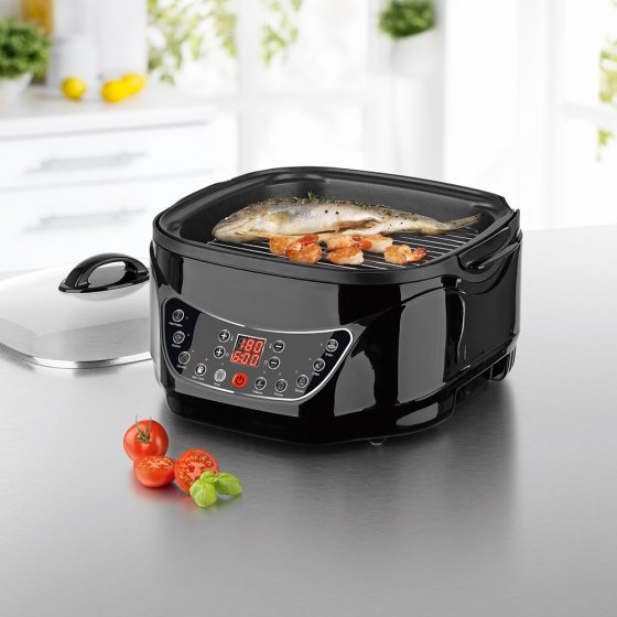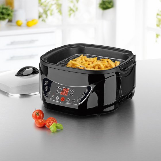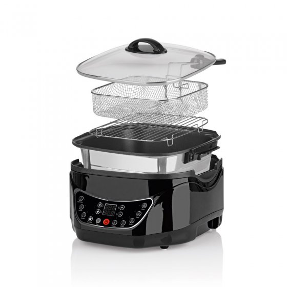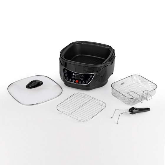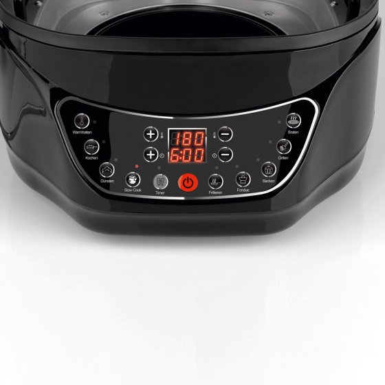 Savourez une bonne fondue entre amis, préparez des légumes en préservant leurs qualités nutritionnelles par cuisson lente ou à l'étuvée, confectionnez un gâteau parfumé, faites vos propres frites à la friture, préparez de bons steaks grillés et une pizza aussi croustillante que celle de la pizzeria. Le MULTICUISEUR NUMÉRIQUE À INFRAROUGE remplace de nombreux ustensiles de cuisine et est à peine plus grand qu'une casserole. Le revêtement antiadhésif empêche les aliments d'attacher et de brûler. Outre la minuterie, l'appareil dispose de nombreuses fonctions pour programmer avec précision le temps de cuisson et exploiter au maximum la diversité des applications. Économisez de la place, de l'argent et des efforts et préparez sans attendre des mets raffinés sans encombrer votre cuisine !
