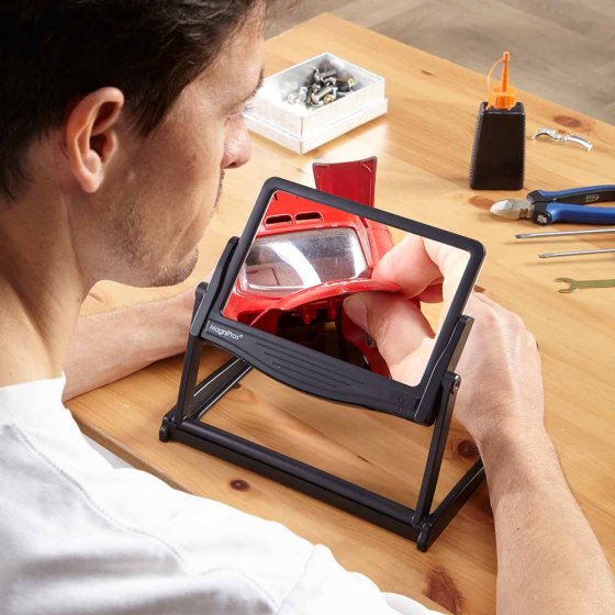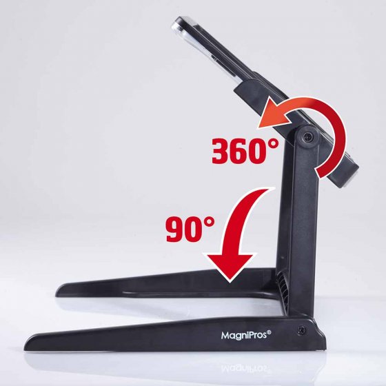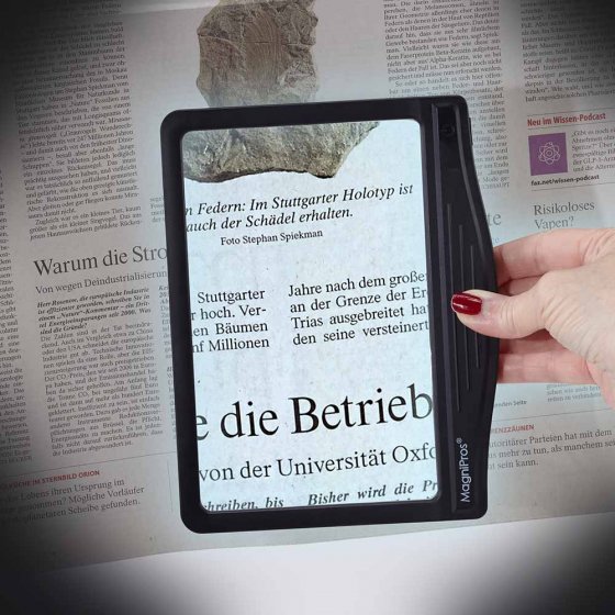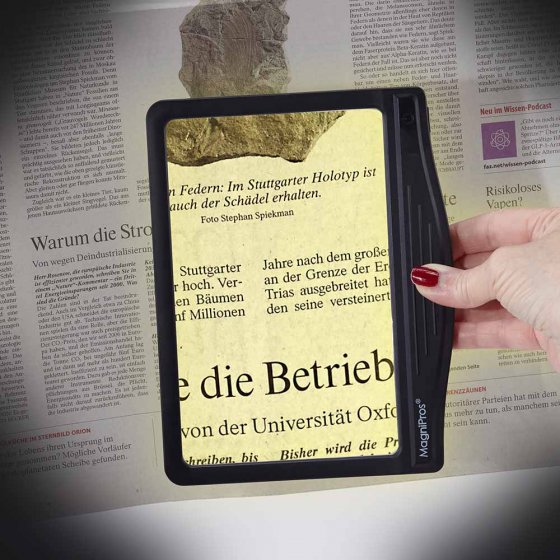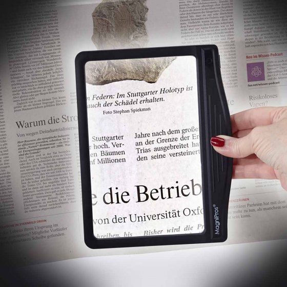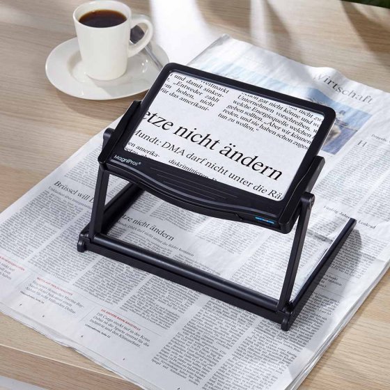 Petits caractères sur les emballages, formulaires ou journaux ? La loupe XL à main et sur pied avec grossissement x5 rend tout texte lisible. Grâce à son éclairage réglable (intensité et couleur de lumière), elle offre des conditions de lecture idéales. Utilisable à la main ou en station fixe grâce au support inclinable et réglable en hauteur. Dimensions (sans pied, L x l x H) : env. 25 x 19 x 2,5 cm. Poids : env. 230 g. Fonction éclairage via 3 piles AAA (non fournies). Plus de clarté au quotidien – pour un confort visuel accru.