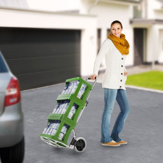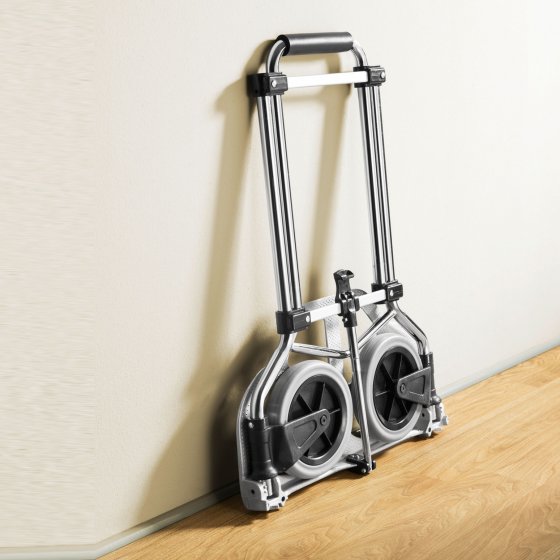 Les caisses à bouteilles, pots de fleurs et cartons sont souvent trop lourds à porter. Le diable compact permet de transporter les objets rapidement d'un endroit à l'autre. Une fois plié, il rentre dans tous les coins et les coffres de voiture. Couleur : argent, noir. Matière : aluminium, ABS, EVA. Dimensions (L x l x H) : 50 x 47 x 102 cm. Charge max. 80 kg.