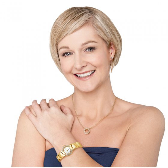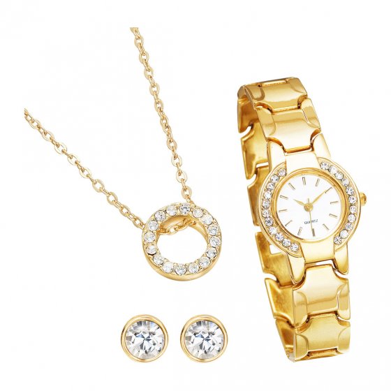 Aimez-vous ce qui est exclusif et raffiné ? Que ce soit au quotidien ou pour les grandes occasions, notre ensemble de 3 bijoux met en valeur votre bon goût de manière discrète. La montre, le collier à pendentif et les deux boucles d’oreilles vous confèrent beaucoup de chic en toutes circonstances. 40 cristaux étincelants donnent encore plus de brillance à l’élégance dorée de cet ensemble. Mouvement à quartz de précision, bracelet à fermoir déployant. Le collier à fermoir mousqueton mesure 45,5 cm de long, les boucles d’oreilles ont un diamètre de 0,5 cm. Matériau : métal doré sans nickel, inox hypoallergénique (clous d’oreilles).