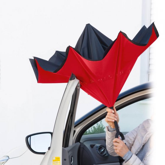 La pluie est souvent accompagnée de vent et les parapluies ordinaires se retournent facilement sous ses assauts. Le parapluie réversible résiste même aux fortes rafales et protège déjà de la pluie quand il est à moitié déployé – par exemple en sortant de voiture. Grâce à son mécanisme spécial, le parapluie ne goutte pas quand on le ferme. Double entoilage noir neutre et rouge tendance à l'intérieur. Dimensions (L x Ø) : env. 76 x 107,5 cm. Poigné confortable en O.
