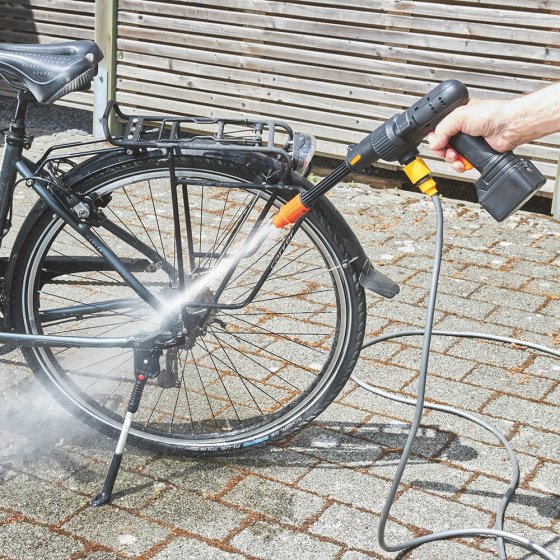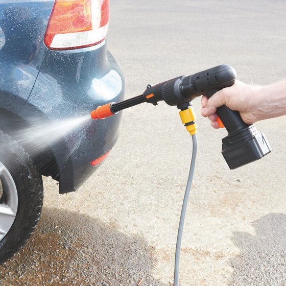 Stuifmeel uit de auto verwijderen, de fiets schoonmaken, vuile tuinmeubelen afspoelen: deze ACCU HOGEDRUKREINIGER 'JET' is daar perfect voor. U heeft voor de werking geen stopcontact of wateraansluiting nodig; een grote emmer water is voldoende. Dompel de slang onder, schakel in en klaar! Dankzij het uitgebreide assortiment accessoires (bijv. zeepreservoir, filter, lansverlenging) is de draadloze hogedrukreiniger net zo veelzijdig als een professioneel apparaat. De waterstraal is 3-voudig verstelbaar. Afmetingen (l x b): ca. 44 x 22 cm. Slanglengte: 5 m. Ook ideaal voor booteigenaren en voor kampeerliefhebbers met caravan of stacaravan!