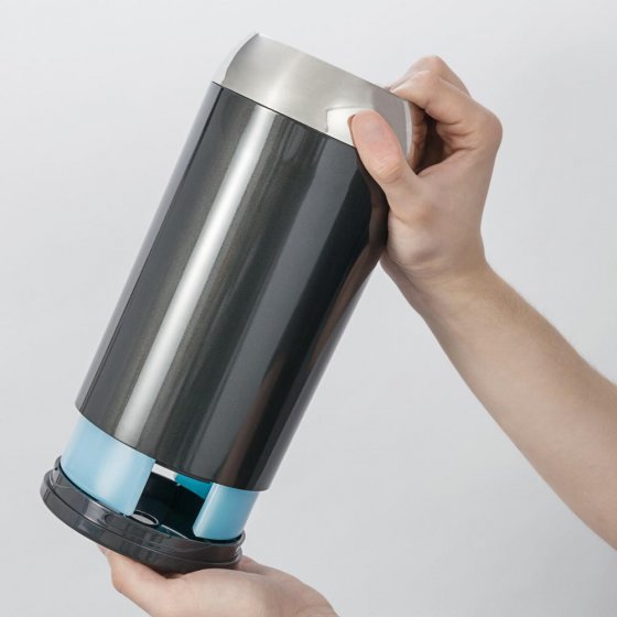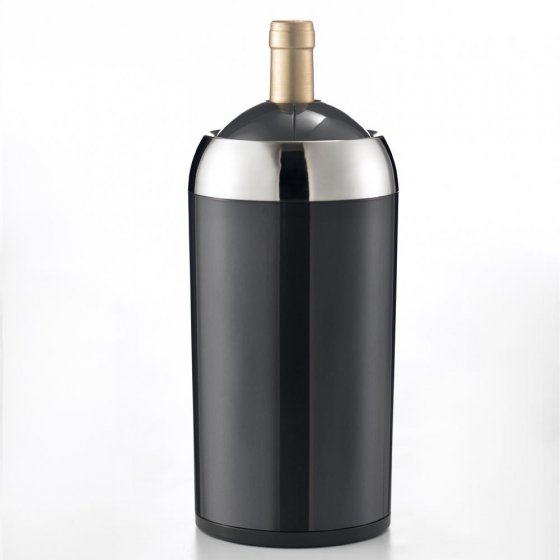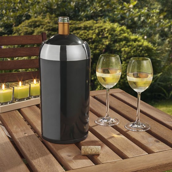 | Geniet van uw, tot aan de laatste druppel perfect gekoelde, drankjes – deze ACTIEVE FLESKOELER maakt het mogelijk! Anders als bij de meeste fleskoelers, blijven uw drankjes niet alleen gelijk in temperatuur, maar worden ze actief gekoeld. En dit al in slechts enkele minuten, dankzij twee koelaccu’s! Het beste komt nog: door een speciale automatische sluiting ontstaat er geen buitencondensaat aan de fles. Hierdoor drupt geen condenswater bij het inschenken op het tafelkleed en de fles ligt altijd goed en veilig in de hand! De fles er gewoon uitnemen – opening gaat automatisch open, fles terugzetten – opening gaat automatisch dicht. Afm.: ca. 26 x Ø 12 cm. Met extragrote opening voor wijn- en water-, sap- en champagneflessen. Corpus van kunststof in antraciet-metallic – koelt uitstekend en ziet er op tafel fantastisch uit! |