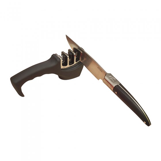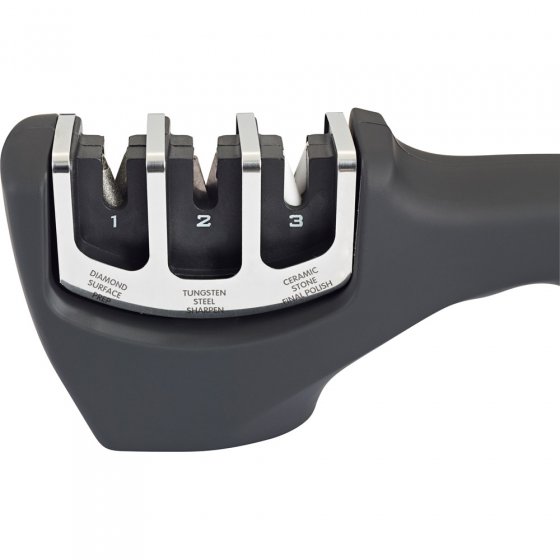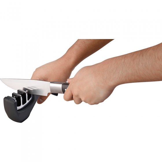 Les couteaux de cuisine ou de table émoussés ou ébréchés demandent plus d’efforts et le risque de blessure est bien plus important qu’avec un couteau aiguisé. Notre AIGUISEUR DE COUTEAUX 3 EN 1 y met fin : la première encoche répare la lame grâce à ses parois en diamant, la deuxième l’aiguise parfaitement grâce à ses parois en acier et la troisième affine son tranchant grâce aux parois en pierre de céramique. Le résultat : des lames extrêmement lisses et affûtées comme des lames de rasoir ! Cet aiguiseur à couteaux est doté d’un manche ergonomique et il ne glisse pas quand on le pose sur une surface lisse et sèche grâce à sa base antidérapante. Dim. env. 20 x 7,5 x 4,5 cm. Ne passez pas à côté de cet aiguiseur !