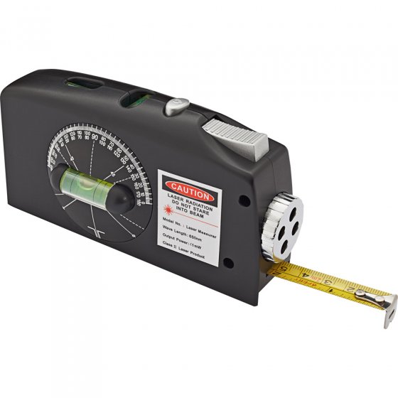 Vous aimez bricoler mais vous êtes minutieux ? Si vous ne faites pas confiance à votre vieux mètre pliant ou à des traits griffonnés au mur pour accrocher un cadre ou poser une étagère, faites appel à notre APPAREIL DE MESURE LASER MULTIFONCTIONS : il projette au choix un point, une ligne (horizontale ou verticale) ou une croix parfaitement droite sur le mur ou le plafond ! En plus d'un pointeur laser, il contient un mètre-ruban de 2 mètres de longueur, une règle (12 cm), trois niveaux à bulles intégrés dans le boîtier ainsi qu'une calculatrice de poche. Des rails de guidage ainsi qu'un dispositif d'accrochage permettent de fixer facilement le mètre sur le mur ou sur une estrade : vous pouvez ainsi découper le long de la ligne formée par le laser. Le pointeur fonctionne avec 2 piles AAA (disponibles séparément) et la calculatrice avec une pile bouton (incluse). Dim.: 13,8 x 6,9 x 35 cm. Vous voulez des mesures ultra précises ? Ne vous fiez plus à vos outils et ne passez pas à côté de cet appareil de mesure moderne !