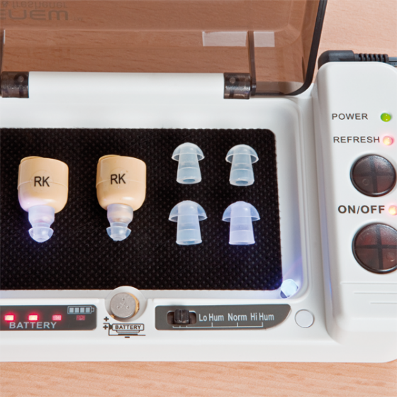 Découvrez une toute nouvelle technologie pour sécher et nettoyer votre système auditif d’une façon hygiénique – sans aucune chimie ! Grâce à la lumière UV, votre APPAREIL POUR SECHER ET NETTOYER LE SYSTEME AUDITIF enlève efficacement l’humidité à l’intérieur et à la surface de votre système auditif. Le cérumen est séché et il ne vous reste plus qu’à l’essuyer. La puissante lumière à rayon ultra violet tue les germes et les bactéries qui s’installent dans le conduit auditif. Ainsi, les rougeurs et démangeaisons peuvent être réduites ou évitées. Simple d’utilisation, compact et léger, l’appareil est idéal en voyage. Une fonctionnalité astucieuse vous permet de vérifier le niveau de batterie de votre appareil auditif : plus de mauvaise surprise liée à une panne de batterie ! Alimentation sur secteur (fournie). Dimensions : env. 15x9x5cm. Cycle de séchage avec minuteur 2, 4 ou 8 heures, testeur de batterie à 5 niveaux. Un appareil très performant afin d’augmenter la capacité et durée de vie de votre appareil auditif et ainsi votre qualité d’audition !