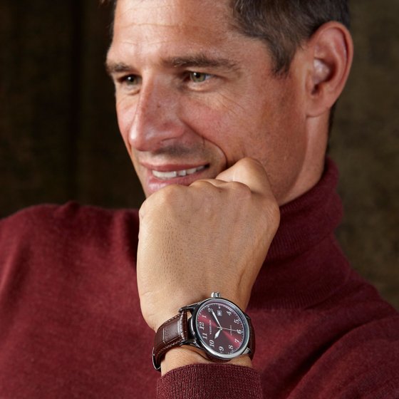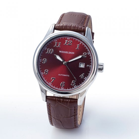 Verleidelijk, extravagant, maar altijd in het oog springend: horloges met een rode wijzerplaat zijn echte blikvangers. En hoe eenvoudiger de rest eruitziet, hoe stijlvoller het totaalbeeld. Zo'n combinatie is perfect voor het AUTOMATISCHE HORLOGE 'ÉLÉGANCE': de zeer opvallende, iriserende rode sunburst-wijzerplaat wordt gepresenteerd in een puristische ronde kast met een traditionele lay-out met 3 wijzers. Het bruine leren bandje met krokodillenprint past er perfect bij. Afmetingen: Ø ca. 40 mm, dikte kast ca. 12 mm. Als u een vleugje kleur mist in uw horlogecollectie dan is de 'Élégance' zeker wat voor u!