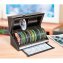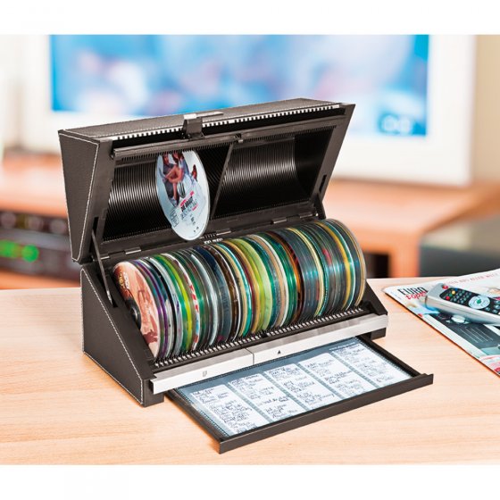 Deze AUTOMATISCHE CD/DVD-ARCHIEFBOX is een perfect georganiseerde „mediaexpert“! In deze box kunnen max. 100 CD’s en DVD’s ruimtebesparend, geordend en individueel gecatalogiseerd worden ondergebracht. Zo heeft u altijd een goed overzicht over uw collectie en hoeft u niet meer lang te zoeken naar de gewenste muziek of film. Deze ultracompacte box is uitgerust met een „discgear“-register waarin u de opgeslagen CD’s/DVD’s kunt registreren. Met één druk op de knop selecteert u het gewenste schijfje. Langzaam en majestueus gaat het deksel open, waarna automatisch de CD of DVD van uw keuze verschijnt. Dankzij de doorgestikte bekleding van zwart kunstleer met gekorrelde look past de box in iedere inrichting. Box van schokvast ABS, afmetingen ca. 33 x 15 x 14 cm.