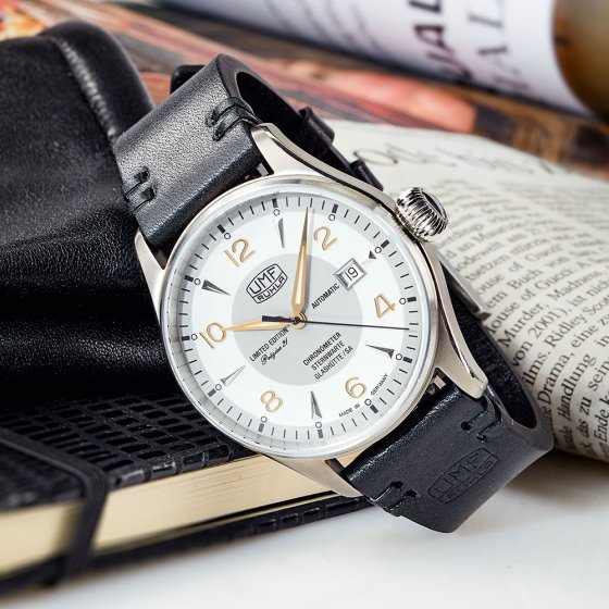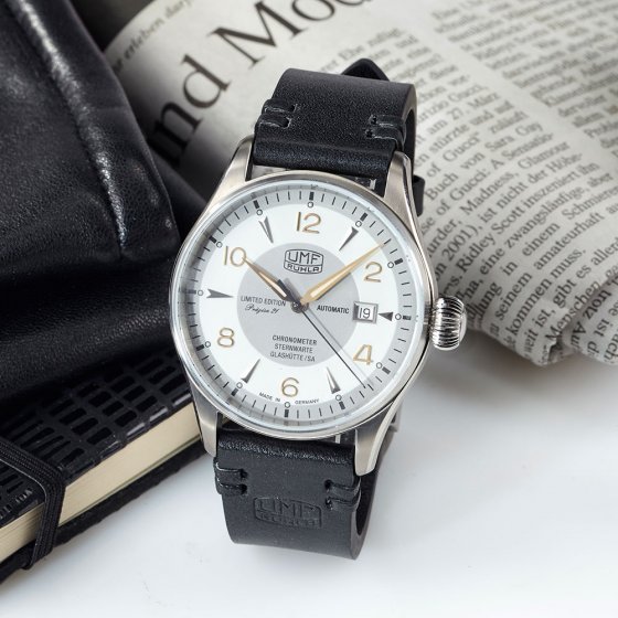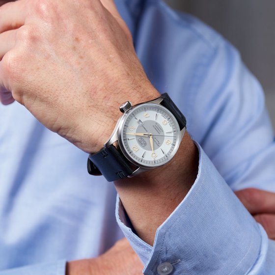 Nauwkeurigheid is het ultieme kwaliteitscriterium voor een automatisch horloge. De AUTOMATISCHE CHRONOMETER 'PRÄZISA 21' is in dit opzicht boven alle twijfel verheven, want hij is officieel als chronometer gecertificeerd door het Duitse officiële testcentrum van het observatorium van Glashütte S. A. De tweekleurige wijzerplaat doet denken aan de originele 'Präzisa'-versie, die van 1948 tot 1963 te koop was. De kast is gemaakt van een antimagnetische titaniumlegering. Een speciaal geïnstalleerde Glucydur-balans in het automatische uurwerk zorgt voor maximale precisie en nauwkeurigheid met een zeer lage thermische uitzettingscoëfficiënt. Het bandje is gemaakt van handgenaaid kalfsleer. Afmetingen: Ø ca. 42 mm, dikte kast ca. 11 mm. Mechanisch aangedreven, vol geschiedenis en uiterst precies: deze combinatie is zelfs in het segment van luxehorloges zeldzaam!