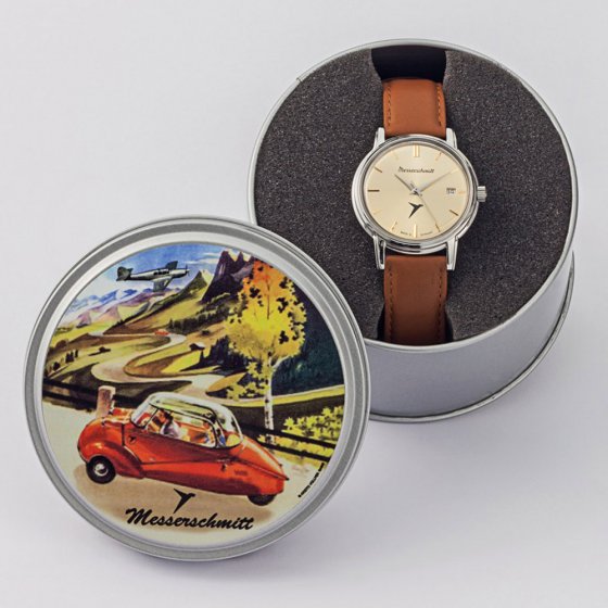 De AUTOMATISCHE MESSERSCHMITT KR200 HORLOGE combineert alle deugden van de Messerschmitt cabine scooter en terecht het label "Made in Germany" verdiend. Voor de aandrijving zorgt een 25 edelstenen gelagerd automatisch uurwerk ST2130 met 28.800 half trillingen. Zelfs op het eerste gezicht openbaart zich, waarmee het ontwerp en zorgvuldig ambachtelijke iedere KR200 wordt gemaakt. Het bolle glas is meer dan alleen een terugkeer naar het dak van de cabine scooter: Het vergemakkelijkt ook het lezen van de klok. Het ontwerp voorkomt opzettelijk onnodige franje. Op de wijzerplaat in retro-look harmoniseren van de kwaliteit zonnestraal en patch uur markers met de Messerschmitt-logo en de iconische Bat-logo. Roestvrij staal behuizing Ø: 38 mm, waterbestendig tot 5 ATM, koepelvormige mineraalglas, datumweergave en lichtbruine lederen