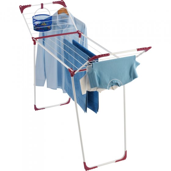 Wie geen tuin met waslijnen heeft maar de lijnen op zijn balkon moet hangen en zo dus niet meer in de zon kan zitten, kent het probleem: het balkon is er alleen maar voor de was – nooit wordt het balkon door mensen gebruikt. Hoe verander je dat? Neem toch het BADKUIP-DROOGREK! De standbenen zijn conisch gevormd, zodat ze gemakkelijk in de badkuip kunnen worden gezet – Probleem opgelost. Zachte silicone hulzen om de standbenen zorgen niet alleen voor een veilige stand op de gladde badkuipbodem, maar verhinderen ook krassen in de badkuip. Het droogrek heeft een totale lijnlengte van 13 m; Kleerhangerogen in de hoekkappen van de openklapbare zijvleugels schaffen nog meer ‘ophangplaats’. Na gebruik kan het rek met twee handgrepen vlak worden opgevouwen. Afm.: ca. 153 x 46 x 76 cm. Met dit praktische product heeft u alle schaapjes in een mum op het droge!