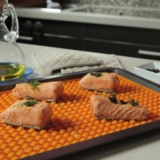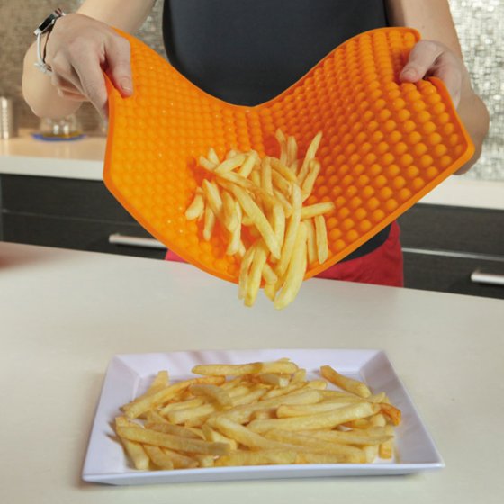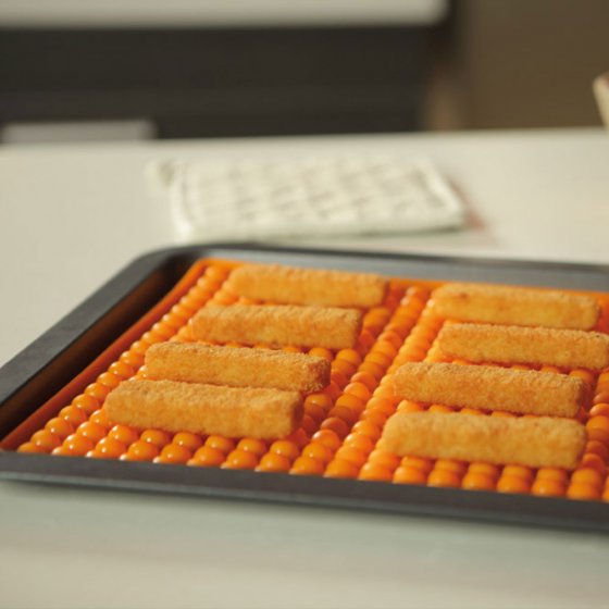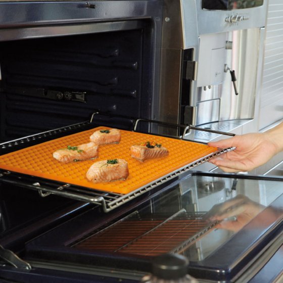Hoe u zonder slecht geweten, van lekkere patat of krokante kipnuggets kunt genieten? Gewoon simpelweg met de handige BAKMAT MET SILICONENNOPPEN! Overtollig vet loopt hier gewoon via de noppen in de tussenruimte naar de bodem – wat over blijft is het pure vetarme genot! Omdat de hete ovenlucht tussen de noppen door optimaal circuleert, lukt het gerecht op een heerlijke vetarme manier. Want het “circulatie-effect” zorgt ervoor dat uw gerechten rondom gelijkmatige gaar en knapperige worden – en dat zelfs zonder omkeren! Aankoeken of verbranden aan het bakblik is voorbij. Zo bespaart u werk en tijd – en de hittebestendige siliconen-mat kan steeds weer opnieuw worden gebruikt! Afm.: ca. 40 x 28 cm. Opgerold opbergen: ruimtebesparend! Reinigen gewoon in de vaatwasser – een super hulp, voor vetarme gezonde voeding!
