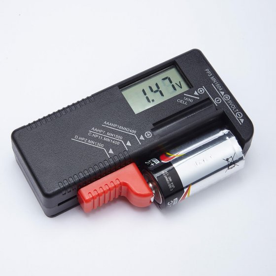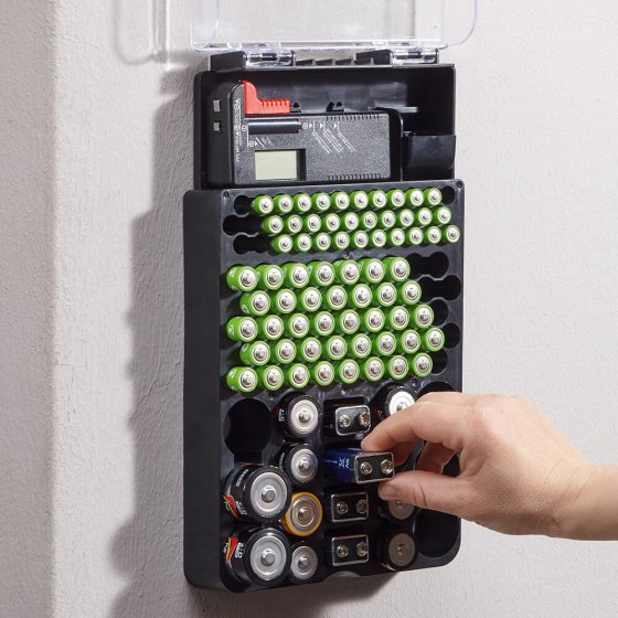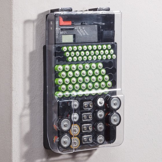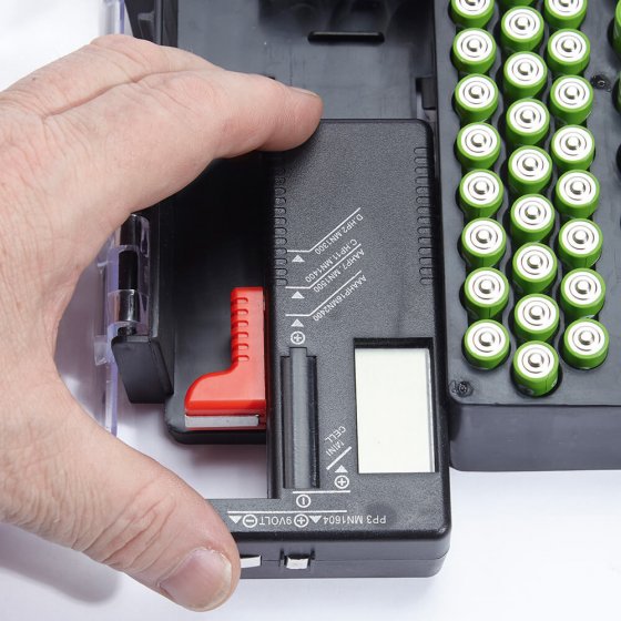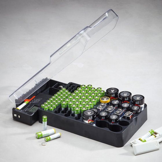 Fabrikanten adviseren batterijen nooit los en open op te bergen – dit geeft explosiegevaar! Deze BATTERIJ-OPBERGBOX MET LCD-TESTER EN BESCHERMHOES biedt ruimte aan meer dan 100 batterijen – met een geoptimaliseerde indeling! De uitneembare tester controleert in een mum van tijd de batterijspanning in volt en geeft deze weer op het lcd-scherm. Dankzij de praktische beschermhoes worden de batterijen beschermd tegen stof en vocht. Ook geschikt voor wandmontage! Afmetingen (l x b x h): ca. 32 x 17,5 x 5,5 cm. Van high-impact polystyreen. Indeling: 45 x AA, 36 x AAA, 4 x 9V-blok-/, 8 x baby-/, 6 x mono-batterijen en 5 knoopcellen. Breng systeem in uw batterijenvoorraad en bescherm uzelf en de kwaliteit van uw batterijen!
