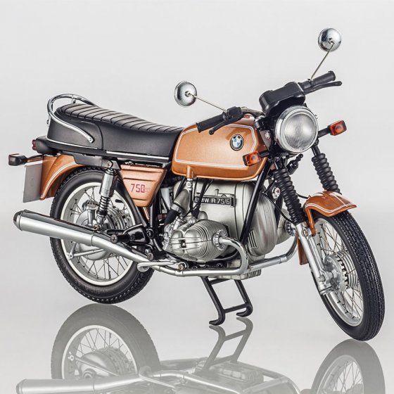de fans ! La série 6 s'est imposée comme pionnière de la boîte à cinq vitesses sur le marché. Les modèles 900 et 750 bénéficiaient également et pour la première fois de freins à disques à l'avant. Autre caractéristique de la BMW R75/6 avec freins à disques : le maître-cylindre de frein sous le réservoir.Tout aussi fascinant : le modèle-réduit fidèle à l'original de cette moto mythique à l'échelle 1:10. Ce modèle en zinc moulé sous pression et parties en plastique vous séduira par ses nombreux détails spectaculaires composés de plus de 100 pièces. Sa laque haute brillance et métallisée couleur curry, ses roues qui tournent à rayons métalliques, sa béquille mobile ainsi que ses suspensions et câbles sont parfaitement fidèles à l'original.