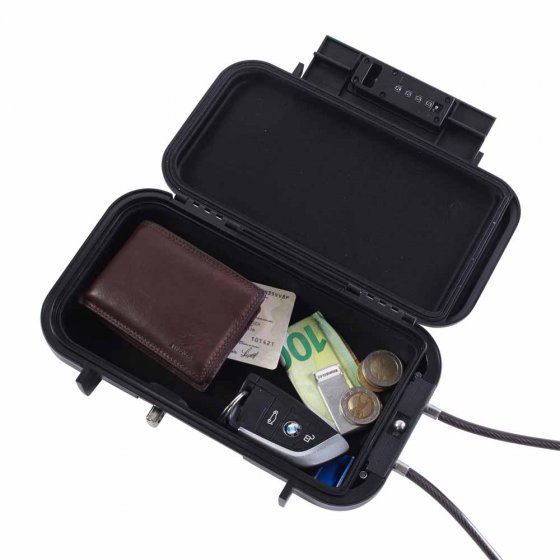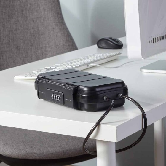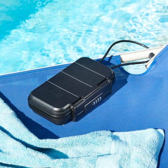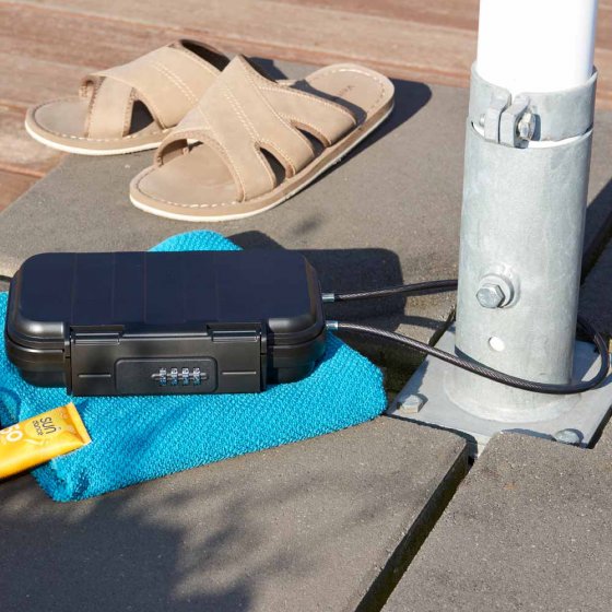 Nager dans la piscine de l'hôtel en laissant son smartphone sans surveillance sur la chaise-longue ? C'est plutôt risqué – sauf si le smartphone se trouve dans la BOÎTE ANTIVOL AVEC SERRURE À COMBINAISON. La boîte est très résistante à la cassure, protège de la poussière et de l'eau (IPX6), et elle est bien protégée contre le vol par son câble d'acier. Il suffit pour cela d'attacher le câble autour d'un poteau et d'insérer le bout libre dans la boîte. Personne ne pourra l'ouvrir, à moins de connaître le code à 4 chiffres. Dimensions de la boîte (L x l x H) : env. 24 x 15 x 6 cm. Longueur du câble d'acier : env. 54 cm. Également idéal pour le centre de gym et le restaurant (quand on doit aller aux toilettes !). Difficile de faire plus sûr.
