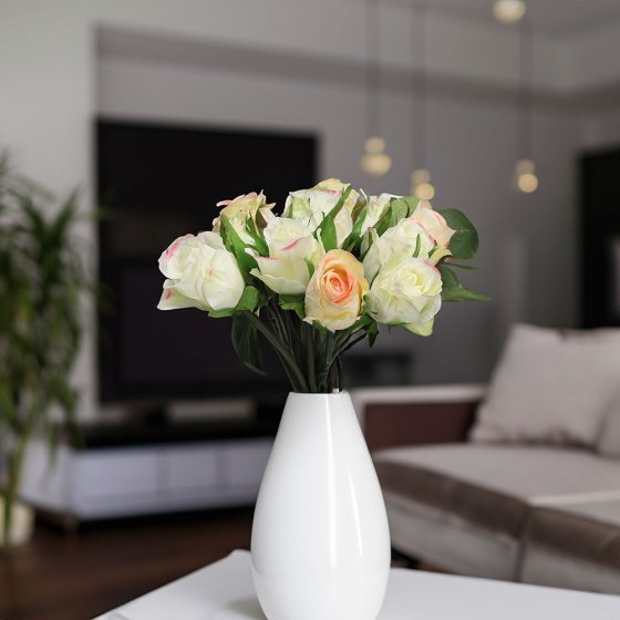 Le BOUQUET DE ROSES INFANABLE ravit les yeux de sa beauté intemporelle. Ce superbe bouquet est composé de 16 roses en tissu : une décoration pleine de charme pour toutes les pièces ou pour une table de fête. Les différentes inflorescences et le jeu de couleurs entre le rose tendre, la teinte chaude de l'abricot et le blanc pur donnent au bouquet une apparence réaliste. Hauteur : env. 29 cm. Parfait pour offrir ou pour se faire soi-même un cadeau !