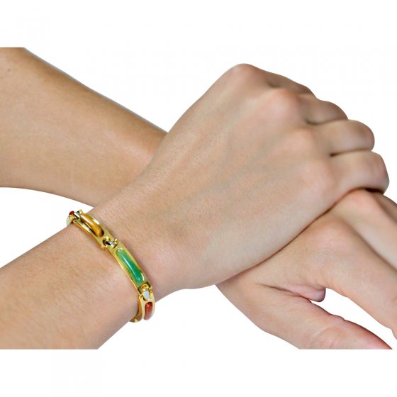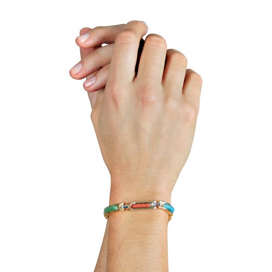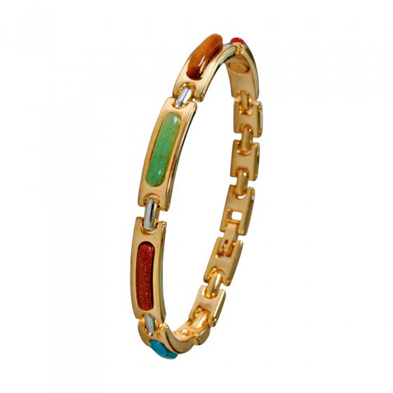 Ce bracelet à aimants et pierres a un secret : il dissimule 5 aimants de chacun 1 000 gauss. Ce bracelet orne votre poignet de son métal doré et de ses cinq pierres polies : onyx rouge, oeil de tigre, aventurine, turquoise minérale et grès doré. Long de 20 cm env., il peut être ajusté à votre taille en ôtant des maillons. Ne convient pas aux femmes enceintes et aux porteurs de pacemaker.
