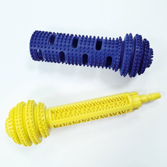 Les chiens ne peuvent pas se brosser les dents, alors que cela serait nécessaire de temps en temps. Offrez donc à votre chien la BROSSE À DENTS LUDIQUE POUR CHIENS afin qu'il s'amuse avec elle ! Elle est en caoutchouc souple et sa forme allongée invite à la mordiller. Pendant que le chien la mastique, les picots sur le dessus enlèvent les dépôts de ses dents et massent ses gencives. Point fort : l'intérieur de la brosse peut être retiré et rempli de friandises ou de pâte dentifrice pour les soins dentaires - le chien pourra en prélever une certaine quantité à travers les trous en mâchant le contenant. Dimensions (Ø x L) : env. 6 x 21 cm. Maintenez la dentition de votre compagnon à quatre pattes en bonne santé !