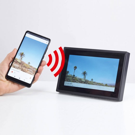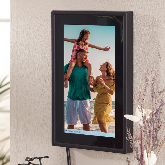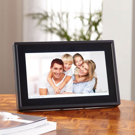 Même quand on ne peut pas se voir en personne, on peut toujours partager les beaux moments de sa vie. Le CADRE PHOTO ET VIDÉO NUMÉRIQUE rapproche les familles et les amis ! Envoyez simplement une carte postale numérique à vos proches, sans ordinateur. Pour la réception, il suffit de connecter l’appareil au réseau wifi du destinataire, sans téléphone portable ni application. Grâce à un code unique, seules les personnes choisies peuvent envoyer des photos ou vidéos. Le cadre peut rester connecté en permanence et mis en veille selon un horaire choisi. Dimensions (l x H x P) : env. 21 x 15 x 3 cm. Écran tactile de 7“, mémoire interne de 8 Go (utilisation possible avec carte micro SD de 32 Go maximum). À poser ou accrocher au mur – vous ne raterez plus aucun moment !