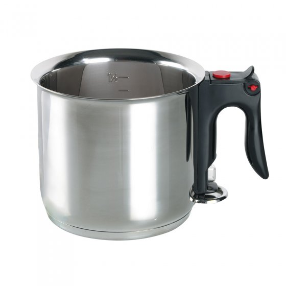 Vous aimez cuisiner de temps à autre du pudding, du riz au lait ou d’autres produits laitiers ? Alors vous n’êtes pas sans savoir qu’après la cuisson vient le récurage car le lait brûle pratiquement systématiquement à la cuisson. À moins d’utiliser notre CASSEROLE BAIN-MARIE. Son double fond (l’espace entre les deux fonds est rempli d’eau) vous permet de chauffer le lait en douceur, l’empêchant ainsi d’attacher ou de déborder ! Cette casserole est également idéale pour faire fondre du chocolat ou réchauffer les plats de bébé et bien plus pratique qu’un bain-marie. En acier inoxydable de grande qualité ; dans son manche en plastique se trouve une fenêtre qui vous permet de lire le niveau de l’eau. Cette casserole à lait s’adapte à tous les feux, y compris l’induction et elle passe au lave-vaisselle ! Dim. : hauteur env. 15 cm, Ø env. 17,5 cm. Contenance : 1,5 l. Assurez vos arrières la prochaine fois que vous cuirez du lait grâce à son double fond !