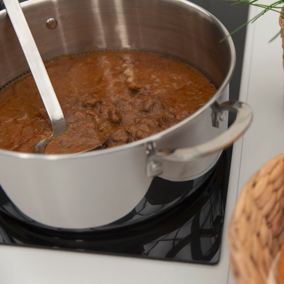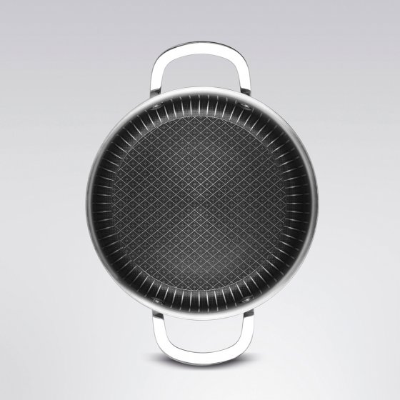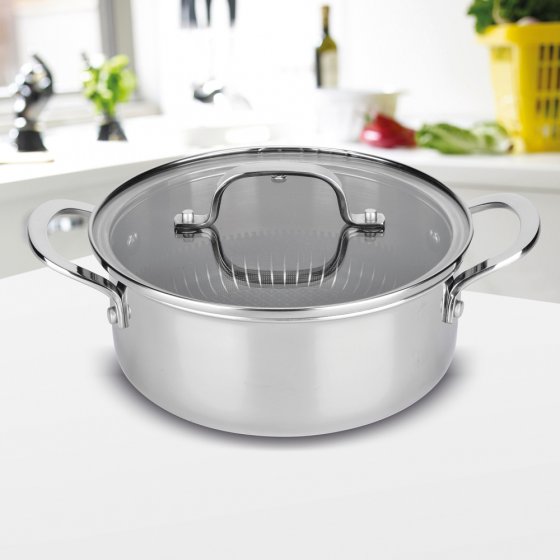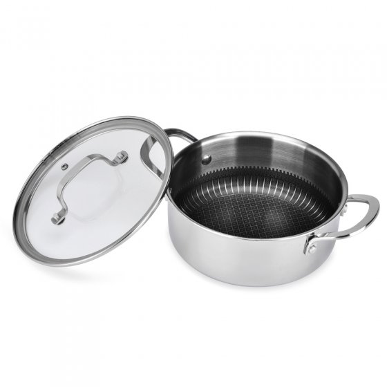 Le plat mitonné était délicieux, mais ensuite, il faut malheureusement bien frotter l'intérieur de la casserole : avez-vous déjà expérimenté cette corvée ? Avec cette grande CASSEROLE MATRIX EN ACIER INOXYDABLE, cela ne vous arrivera plus ! Son intérieur est doté d'une matrice antiadhésive gravée au laser à la base, qui empêche les aliments d'attacher. Grâce aux particules de diamant intégrées, la matrice est en outre insensible aux rayures ; vous pouvez sans souci remuer les aliments avec un fouet. Le fond de la casserole, conçu en 3 couches avec une âme en aluminium, assure une répartition très rapide et homogène de la chaleur. Dimensions : Ø env. 28 cm, hauteur de la casserole env. 12 cm, capacité env. 7 L. Dégustez des ragoûts, des rôtis braisés, des goulashs, etc. sans devoir les "récurer" ensuite !