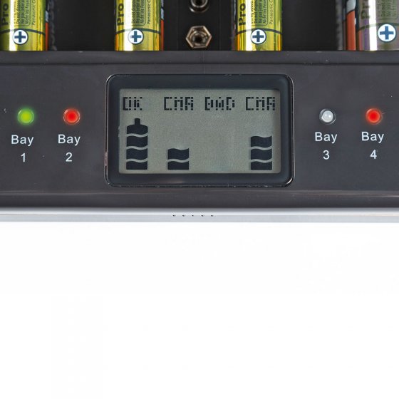 Le chargeur fonctionne selon une technologie de pointe qui lui permet d'identifier chaque pile, d'afficher son état sur l'écran et de démarrer automatiquement le programme. Les batteries sont rechargées à 100 % de leur capacité et n'ont pas besoin d'être retirées de l'appareil à la fin du processus : le chargeur passe en mode de maintien de charge et prévient ainsi tout risque de surcharge. Technologiquement très au point, il décharge aussi automatiquement les batteries Ni-Cd afin d'éviter l'effet mémoire. Le temps de charge peut varier selon le type et l'état des batteries.