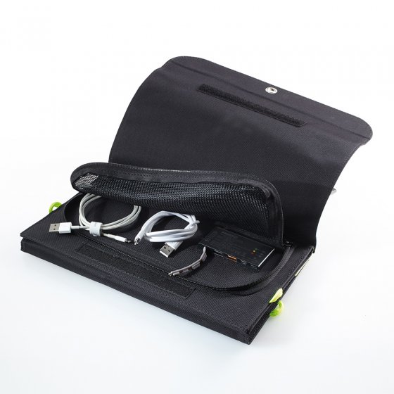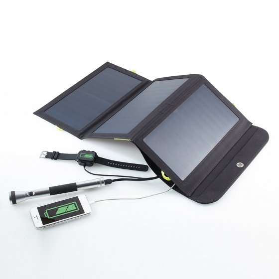 Vous cherchez une possibilité d’alimenter à tout moment en électricité les smartphones, tablettes, caméras et autres appareils indépendamment du réseau électrique ? Le CHARGEUR SOLAIRE PLIANT est la solution idéale ! Grâce à un accumulateur extra large de 10.000 mAh, il fournit de l’énergie non seulement quand on en a besoin, mais aussi quand l’accumulateur est vide. Il suffit de le placer au soleil – et le panneau solaire de 21 W peut transmettre l’énergie récupérée à trois appareils en même temps. Quand il ne sert pas, il se replie au format de poche pratique (L x l x H : env. 31 x 18 x 3 cm) et trouve une place partout... dans une valise, un sac à dos ou dans le vide-poche de la voiture. Soyez indépendant et faites la nique aux fournisseurs d’énergie.