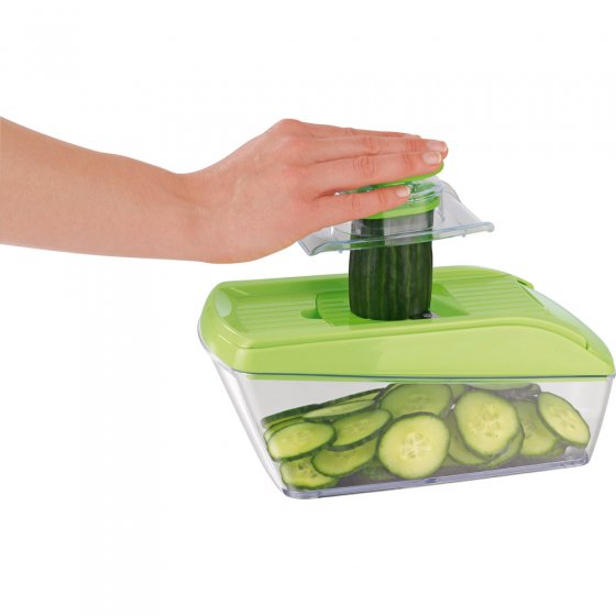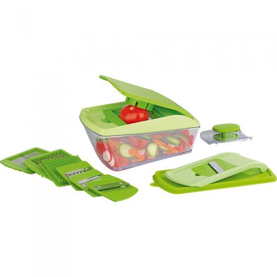 Couper des fruits et légumes frais, bien régulièrement et en un rien de temps : très malin, le CHOP'N SLICE PRO est l'accessoire idéal pour transformer vos fruits et légumes en cubes, rondelles, allumettes, quarts ou huitièmes des plus appétissants – en un instant et sans le moindre effort ! Après avoir choisi la fonction souhaitée vous pourrez par exemple râper des carottes fraîches, découper des poivrons en cubes, des tomates en huitièmes ou des concombres en tranches minces. Le récipient est livré avec son couvercle, ce qui permet de conserver ou de transporter les aliments. Dim. (L x l x h) env. 26 x 12 x 12 cm. Set de 15 ustensiles avec nombreux embouts, tampons ainsi qu'un protège-doigts.