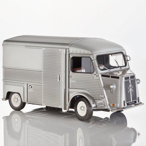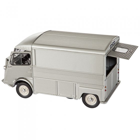 La CITRO ËN HY est une véritable légende en France ! Cette étonnante camionnette en tôle ondulée était en circulation de 1947 à 1981. Le secret de sa longue carrière : sa polyvalence. Son moteur (50 ch, 78 km / h, cylindrée de 1911 m3) se trouvant à l’avant du véhicule, il était possible de l’aménager selon les besoins : camion de pompiers, épicerie, ambulance ou encore boucherie ambulante, etc. Notre modèle réduit en zinc moulé sous pression à l’échelle 1:18 est tout aussi fascinant que l’original et fidèle jusque dans les moindres détails : véritable tôle ondulée, calandre large, roues arrières dirigeables, portes avant et hayon mobiles. Il serait presque dommage de l’installer dans une vitrine de collection : vos amis et invités n’ont pas fini d’admirer ce modèle réduit !