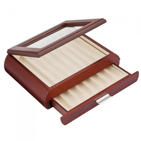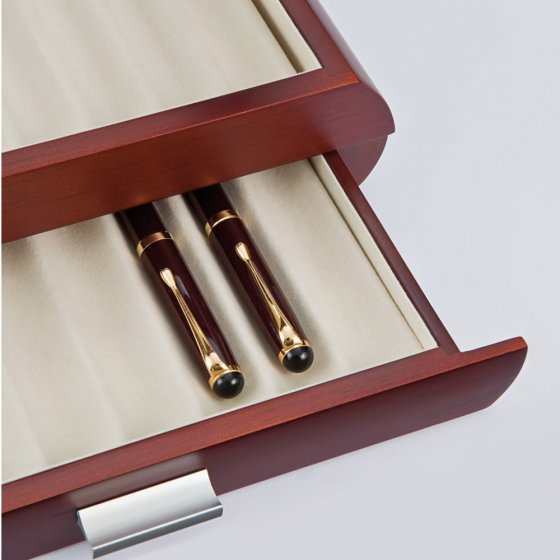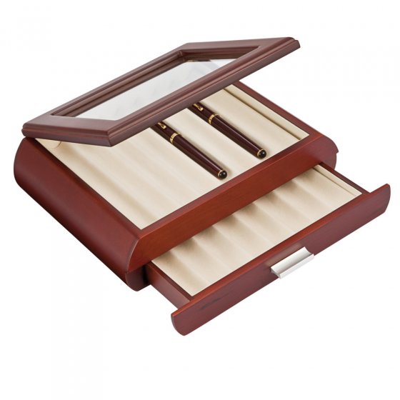 N’enfermez plus vos plus beaux porte-plumes et stylos à bille dans un tiroir où personne ne les voit ! Couchées sur la soie de ce superbe COFFRET À STYLOS, vos pièces de collection pourront être admirées comme il se doit et seront en même temps protégées de la poussière et bien rangées. La forme du coffret est praticulièrement bien travaillée en bouleau massif dans les tons bois de rose. Un objet de luxe très décoratif qui se fond dans tous les intérieurs et met en valeur votre collection ! Le couvercle en verre permet de voir vos stylos les plus précieux qui sont accessibles instantanément. Le compartiment supérieur et le tiroir peuvent contenir 16 stylos à eux deux. Dim. env. 24 x 20 x 7 cm. Un accessoire à la fois superbe et pratique et une excellente idée de cadeau pour les collectionneurs !