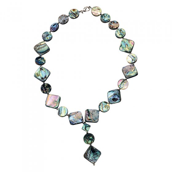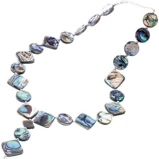 Ce superbe COLLIER EN NACRE D’ORMEAU est constitué de 25 losanges et ronds délicats en nacre d’ormeau dont les belles couleurs scintillantes vont du blanc ivoire au pourpre en passant par le vert jade et le bleu turquoise et qui sont encadrés de petites perles argentées. Les pêcheurs philippins sondent les eaux bleu profond du Pacifique à la recherche d’un type de coquillage bien particulier appelé « Oreille de mer » produisant la jolie nacre d’ormeau aux superbes couleurs et dont sont fait des bijoux de rêve. Longueur de la chaîne avec chaînette de réglage : 55 cm. Un collier au charme mystérieux et le cadeau idéal pour les femmes qui aiment les bijoux hors du commun !
