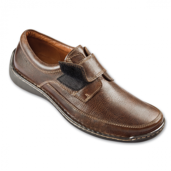 Glip in deze COMFOR –SCHOEN MET KLITTENBANDSLUITING en u zult hem niet meer uit willen trekken! Robuust en oerdegelijk afgewerkt, is hij gewoonweg verbluffend licht. U merkt ternauwernood, dat u hem aan heeft! De wijde, anatomische vorm geeft voet en tenen voldoende speelruimte zowel in de hoogte als ook in de breedte. Het opgevulde „LightWalk“- voetbed zorgt voor een lichtverende tred en is daardoor veel minder vermoeiend voor benen en voeten. De eveneens opgevulde hiel voorkomt kneuzingen. Door de klittenbandsluiting kunt u de breedte zo aanpassen dat het aangenaam is en u goed in en uit kunt stappen. De antislip profielzool is als kenmerk voor stevigheid en duurzaamheid doorgestikt. Ze is aan de achterkant hoog opgetrokken, waardoor het leer niet zo snel slijt tijdens het autorijden. Zorgvuldige afwerking met luxueuze siernaden. Bovenmateriaal en dekzool van 100% leer, kleur: bruin. Made in Portugal. Een mannelijke schoen en ware weldaad voor uw voeten.