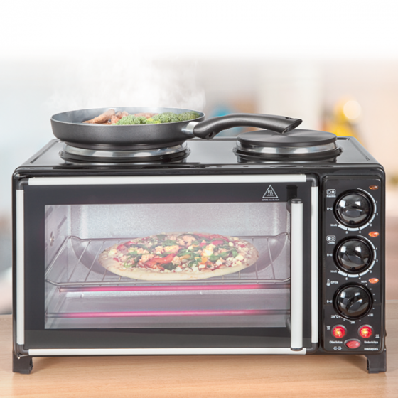 Met een grootte van slechts ca. 55 x 38 x 34 cm past de COMPACTE KLEINE KEUKEN in elke hoek – maar presteert net zoveel als de hele groten. Door de gecombineerde functie kunnen kookplaat en (bak)oven parallel worden gebruikt. Zo kunt u braden, koken, bakken, alles tegelijkertijd en u heeft hiervoor maar heel weinig ruimt nodig. Hij heeft een extra grote bakruimte (ca. 30 L), achter de deur met dubbel glas, die zelfs geschikt is voor de toebereiding van een grote pizza. Incl. speciaal element voor optimale warmteverdeling en automatische draaispit. Boven- en onderwarmte apart en tegelijk regelbaar. Temperatuur traploos van 50-250˚, totaal vermogen 1400 W. 2 kwalitatieve kookplaten (ø ca. 19 cm en 16 cm), totaal vermogen 1700 W. kookplaatbereik met overlooprand. Met deze compacte keuken oogst u beslist veel bijval – ook ideaal voor eenpersoonshuishouden, vakantiehuisje en camping!
