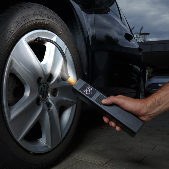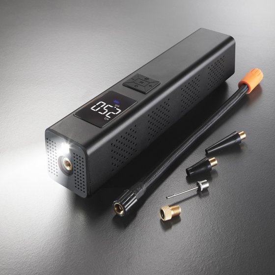 Un des meilleurs ! Le COMPRESSEUR D'AIR SANS FIL RECHARGEABLE en aluminium robuste gonfle les pneus encore plus vite exactement à la pression souhaitée. Sa pièce maîtresse est un moteur nouvellement conçu de 120 W au lieu des 80 W ordinaires. Le débit d'air ainsi généré est de 22 l/min, donc 50 % de plus que les autres modèles. L'énergie nécessaire est fournie par la batterie li-ion performante de 6.000 mAh, une valeur également optimale. Et le maniement ? Il est encore plus aisé car le compresseur se manipule d'une seule main et dispose d'un écran grand format à affichage LED clair et lisible. Saisissez la pression souhaitée ou recourez aux symboles préréglés (auto, moto, vélo, ballon, saisie libre) et à leur valeur de référence - puis mettez l'appareil en marche - c'est tout. Une fois la pression souhaitée atteinte, le compresseur s'arrête automatiquement. Rechargeable par connexion USB-C moderne ou par la prise 12 V de la voiture. Dimensions (L x l x H) : env. 23 x 5 x 5 cm. Poids env. 600 g. Malgré toutes ces améliorations, la pompe a gardé sa forme compacte et peut être facilement rangée en tout endroit. Pour votre prochain voyage, prenez la route plus vite et plus sûrement !