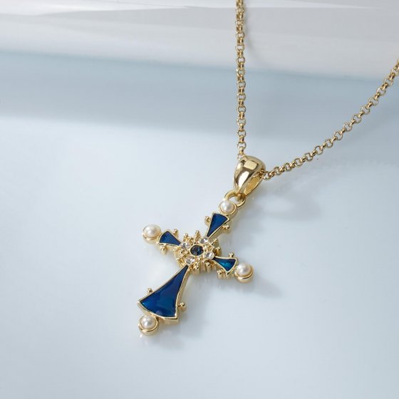 La CROIX PORTE-BONHEUR "ISABELLA" avec chaîne est vraiment ravissante avec sa belle couleur bleu saphir et ses perles d’eau douce, mais elle est aussi porteuse d’un mythe, car elle s’inspire de la croix d’Isabelle Ire de Castille, reine de Castille et d’Aragon au XVe siècle. Isabelle et son époux Ferdinand d’Aragon ayant exercé une grande influence sur toute l’Europe, la croix est vite devenue un symbole de richesse et de succès. Faites-vous plaisir avec ce bijou noble dont la chaîne et le pendentif sont doré à l’or fin véritable (585/1.000). Dimensions (L x l) : env. 4 x 2,5 cm. Longueur de la chaîne : env. 42 cm plus rallonge de 5 cm. Un joyau vraiment royal !