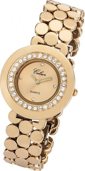 In deze vergulde DAMES SIERRAADHORLOGE stralen 36 swarosvki Elements® met de drager om de inzet - een mooi gezicht! Met de prachtig vloeiende schakelarmband van vergulde sieraadplaatjes, max. Lengte ongeveer 20 cm (ongeveer 2 stappen inkortbaar). Behuizing Ø van ong. 33 mm, met nauwkeurig quartz uurwerk. Als geen ander begrijpt deze horloge te schitteren als een juweel - en is daarom dubbel gewenst!