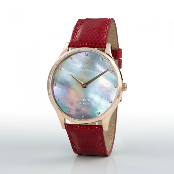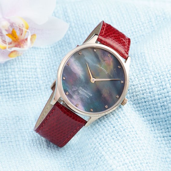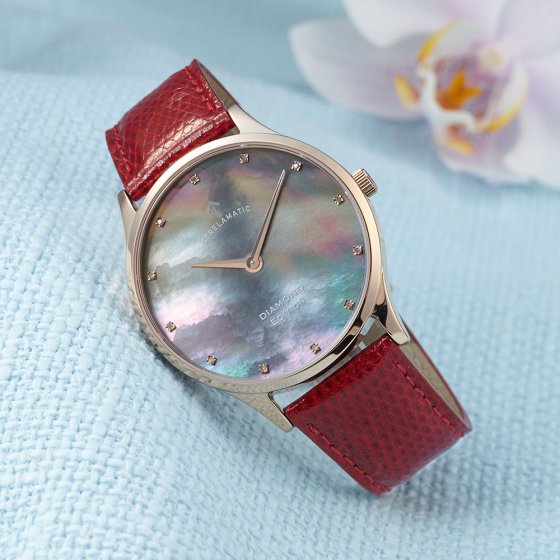 ’Tijd is luxe’ en het is precies deze luxe die u om u pols draagt met DAMESHORLOGE ’NORDSTRAND DIAMANT’. De streng gelimiteerde editie met het Zwitserse kwaliteitsuurwerk Ronda 762 is een echt juweeltje – vervaardigd in Stralsund aan de Oostzee. De edelstalen kast in rozegoud (10 ATM) is aan de onderkant fijn geschroefd. Het krasvaste saffierglas beschermt de wijzerplaat van donker parelmoer. 12 fonkelende diamanten (in totaal 0,05 kt) vormen de indexering van het horloge. Met luxueuze armband van hagedissenleer. Afmetingen (h x ø): ca. 7 x 40 mm. Samengesteld door de meest ervaren horlogemakers, gelimiteerd tot 299 exemplaren. Sier uw pols met dit bijzondere horloge.
