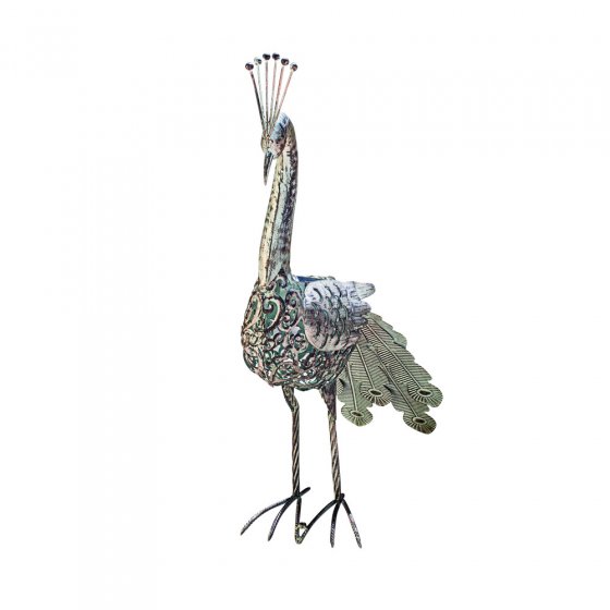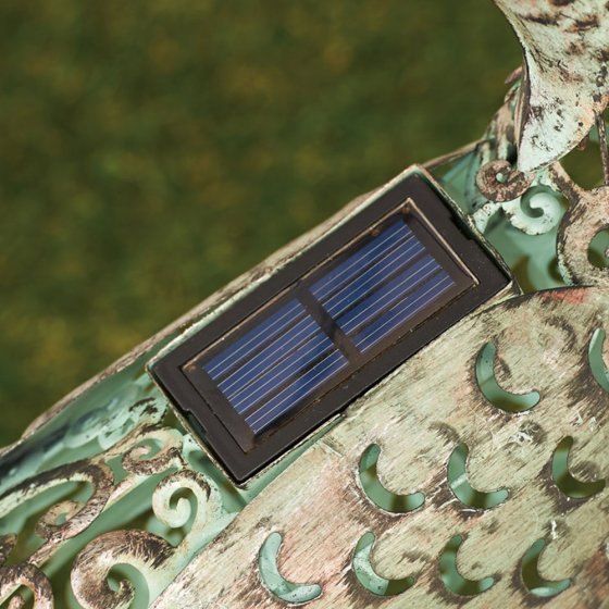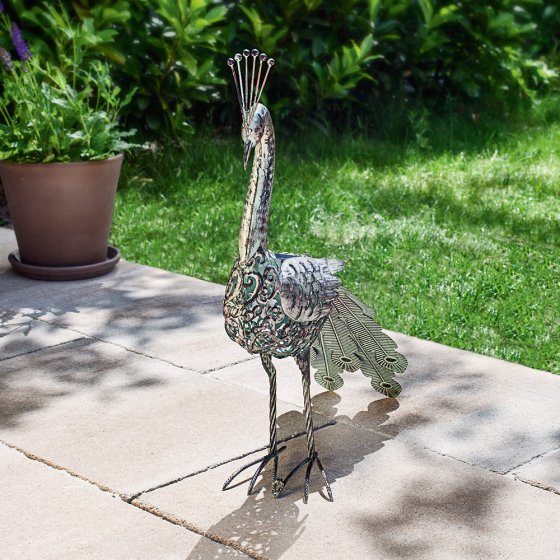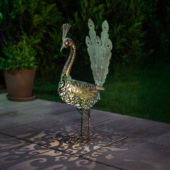 Deze decoratieve PAUW MET VERLICHTING OP ZONNE-ENERGIE vervaardigd uit weersbestendig metaal maakt iedereen in de omgeving blij. Ten eerste, u en uw buren met de zacht verlichte ledlichteenheid in het lichaam van de vogel - ofwel wit licht ofwel subtiel wisselend in alle kleuren van de regenboog. Ten tweede, laadt de accu gedurende de dag op met behulp van een zonnepaneel - bij valavond schakelt de schemersensor het licht aan en verandert het decoratieve element in gepatineerde koperen look in een extravagante buitenlamp. Montage met een grondpen. Hoogte:ca. 60 cm. Een opvallende en decoratieve "eyecatcher"!