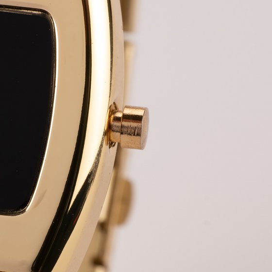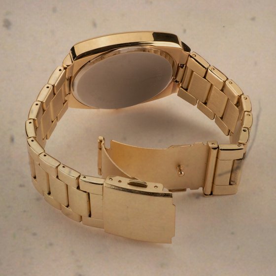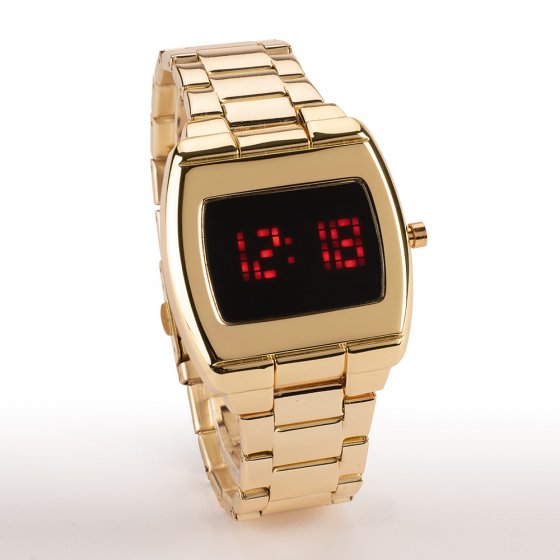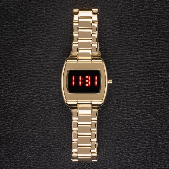 Net als het eerste digitale horloge lichten de rode leds van uw nieuwe digitale horloge ‘Pionier’ op met een druk op de knop en geven ze de tijd nauwkeurig aan. Materiaal: nikkelvrij roestvrij staal, kleur: goud. Verzeker u van dit buitengewone horloge voor uw collectie en word een stijlicoon!