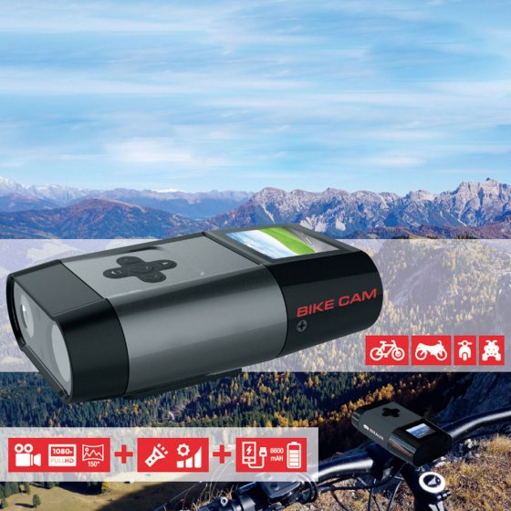 Nu niet alleen meer voor de auto: met deze mobiele DIGITALE CAMERA VOOR OP DE FIETS op het stuur kunt u alle gevaarlijke verkeerssituaties en idyllische fietstochtjes in HD-kwaliteit opnemen. Dankzij het praktische 1,5 inch-display hoeft u tot thuis te wachten om de beelden met geluid te bekijken. Het lichte apparaat is waterdicht volgens IP 65 en zelfs uitgevoerd met een lamp, die uw fietsverlichting indien nodig aanvult. Dankzij de krachtige accu’s met 10 uur looptijd kan de camera bovendien als powerbank gebruikt worden. Afm. (lxbxh): ca. 11x7x4 cm. Leg al uw belevenissen vast!