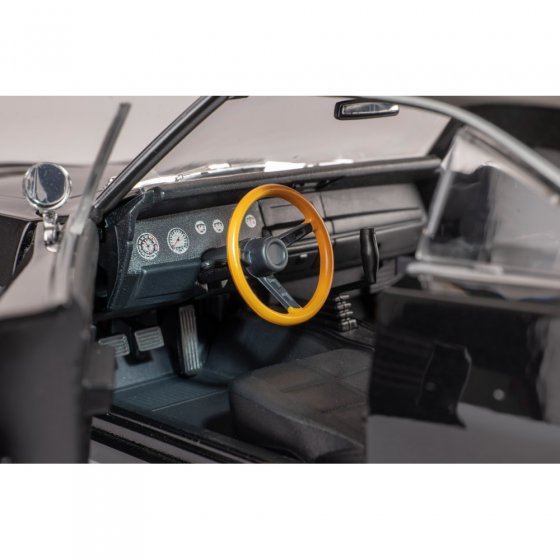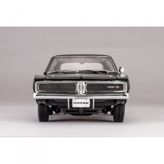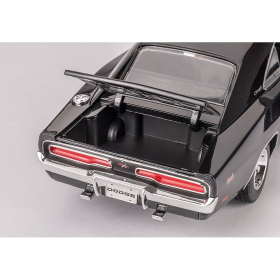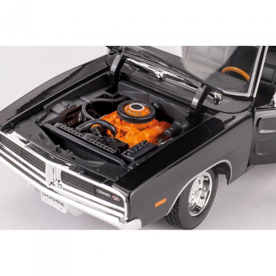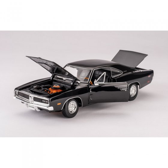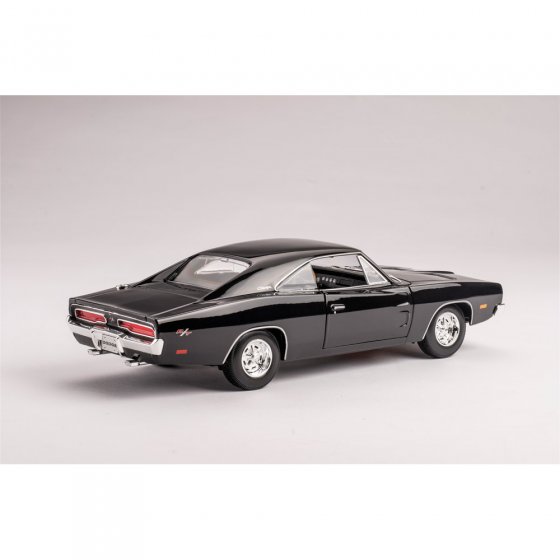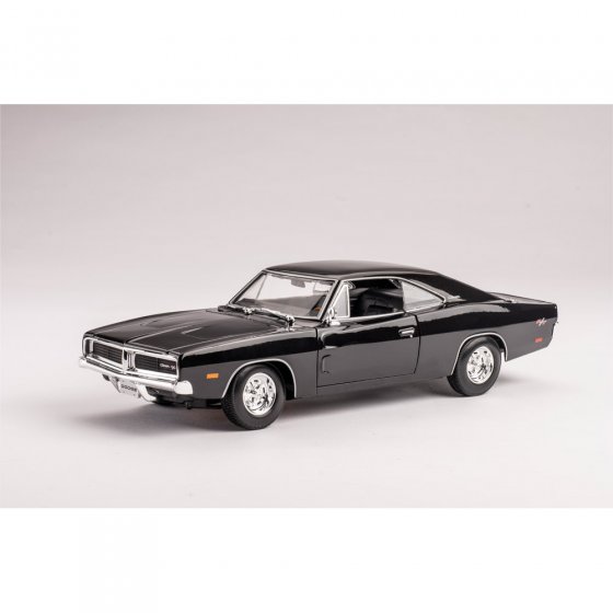 Amerikaanse muscle cars uit de late jaren 60 hebben nog steeds een grote schare fans. Een van de mooiste is de 2e generatie Dodge Charger, gebouwd vanaf 1969: zijn carrosserie met een brutale 'heupzwaai' en schuin aflopende achterkant verrukt auto-estheten al meer dan 50 jaar. Onder de eindeloos lange motorkap zat vrijwel altijd een grote 8-cilindermotor met een cilinderinhoud tot 7,2 l (440 Magnum-versie). Het 1:18-model DODGE CHARGER R/T 1969 toont de klassieke muscle car in elegant zwart. In deze kleur komt de vorm bijzonder goed tot zijn recht. Afmetingen (l x b x h): ca. 33 x 17 x 13 cm. Wie van stijlvolle auto's houdt, moet dit model gewoon bestellen!