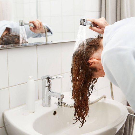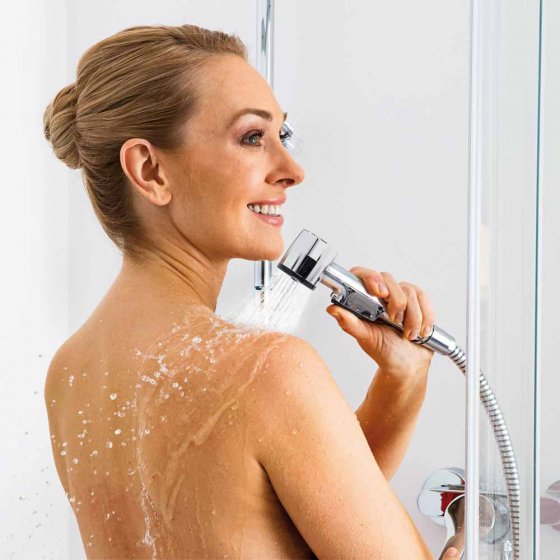 Maak uw lichaamsverzorging nog comfortabeler: met de douchekop met start-stopfunctie kan de waterstraal bij de douchekop rechtstreeks worden geregeld. Hierdoor hoeft u niet te reiken. Geschikt voor alle in de handel verkrijgbare doucheslangen (1/2 inch schroefdraad), ideaal voor thuis. Met antikalk-opzetstukken voor hygiënische lichaamsreiniging. Afmetingen (l x b x h): ca. 4 x 5 x 18 cm. Chroomkleur.