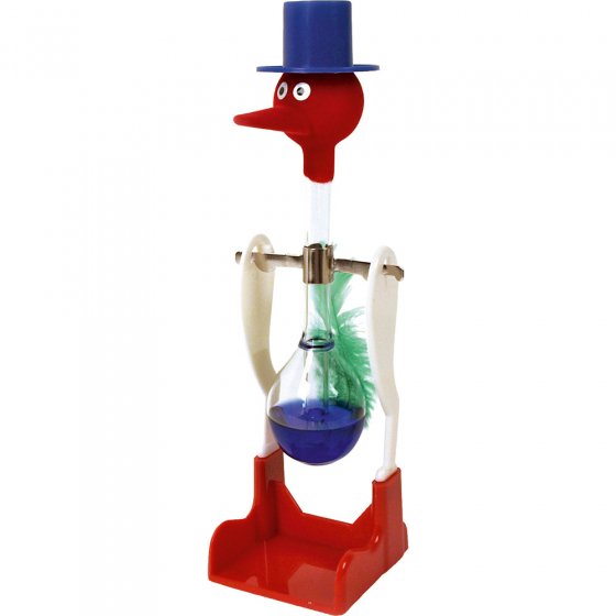 Het spreekt alle de wetten van de thermodynamica tegen: zonder duidelijke stroomvoorziening maakt de DRINKENDE VOGEL wip bewegingen - hij "drinkt" voortdurend uit een voor hem geplaatste schaal met vloeistof. Dat de bewegingen met de omgevingstemperatuur samenhangen is niet gemakkelijk te herkennen zelfs niet door slimme koppen: De gekozen drinkoplossing moet gemakkelijk verdampbaar zijn bij kamertemperatuur (water of alcohol). Afmetingen (L x B x H): ca. 7 x 6 x 18 cm. Stel uw vrienden en bezoekers voor een spannend mysterie: waarom wordt de vogel niet "drink moe"?