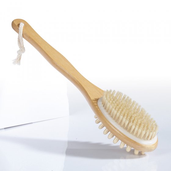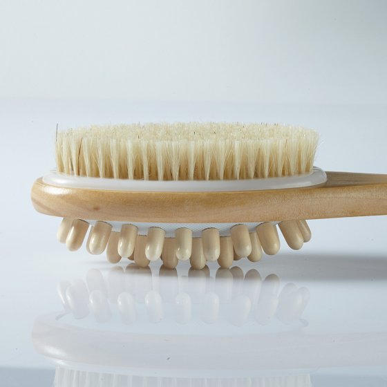Deze badborstel van Theaceae-hout beschikt over 2 verschillende kanten. De ene kant is gemaakt van natuurlijk, zacht varkenshaar, wat perfect is voor zachte en onstpannende lichaamsverzorging. De andere kant heeft zachte en afgeronde houten pinnen die een natuurlijke en onstpannende lichaamsmassage mogelijk maken. Afmetingen: (l x b x h): ca. 37 x 7,8 x 5,8 cm, met ophanglusje.
