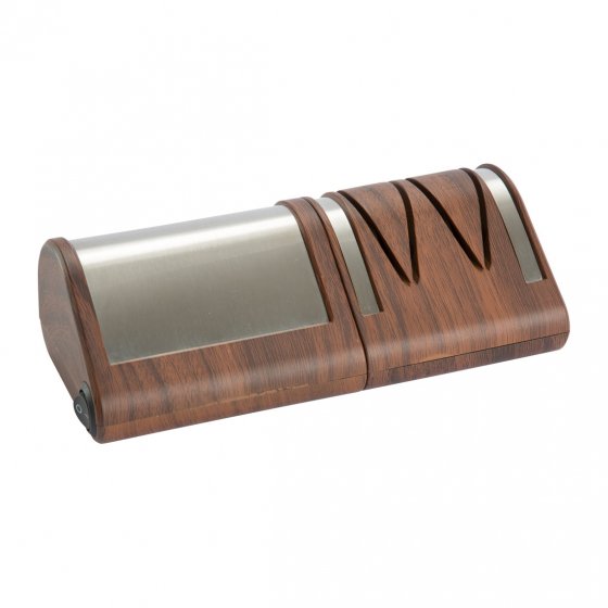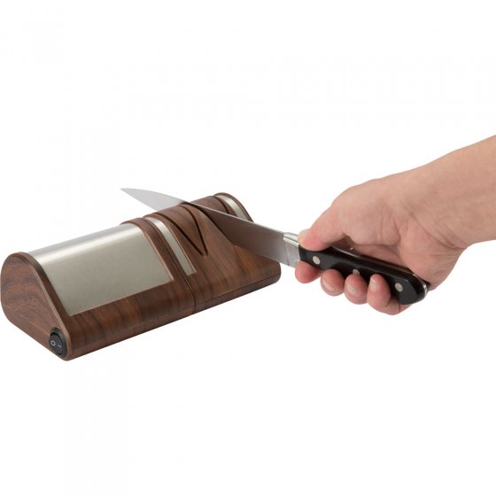 Ook hoogwaardige messen worden ooit bot. Met de ELEKTRISCHE 2-FASEN-MESSENSLIJPER maakt u ze probleemloos weer scherp: de 4 in de slijper roterende slijpschijven met synthetische poeder-diamantcoating maken elk glad lemmet weer vlijmscherp! In fase 1 (grof) wordt het lemmet recht gezet en grof geslepen; in fase 2 (fijn) wordt het gepolijst. De mate van hardheid speelt geen rol – u kunt zelfs keramische messen slijpen. Geleiders zorgen ervoor dat het mes altijd in de juiste hoek wordt geslepen. Afm. (lxbxh): ca. 7x21x10 cm. Werkt op 230 V. Maak van uw messen precisie-snijgereedschap!