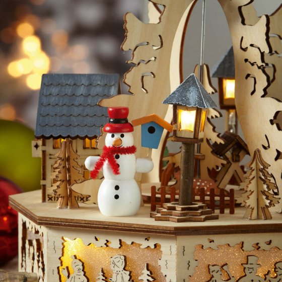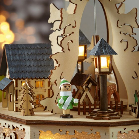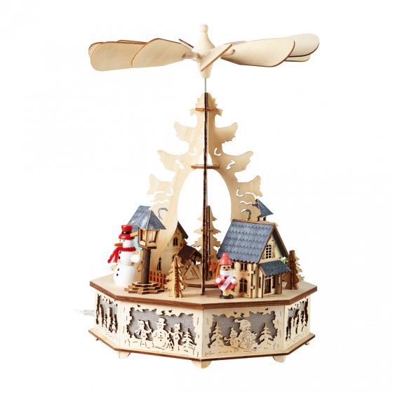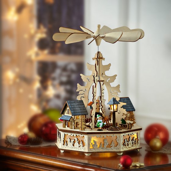 Stralende lichtjes, een feestelijke glans heerlijk ruikende koek: de kersttijd komt dichterbij. En met sfeervolle verlichting kan men helemaal niet vroeg genoeg beginnen. Met de ELEKTRISCHE ADVENTSPYRAMIDE hoeft u zich niet druk te maken, want in plaats van de vlam van een kaars drijft een motortje de vleugels boven het idyllische dorpstafereeltje aan. Geheel ongevaarlijk en zonder kaarsvetvlekken of roet zorgt hij met in totaal 8 energiebesparende leds nu al voor een feestelijke sfeer. Werkt op de meegeleverde 230-V-netadapter. Afm. (bxh): ca. 22x37 cm. Van deze piramide, die u alleen bij EUROtops kan bestellen, kunt u nu al veel plezier beleven.