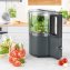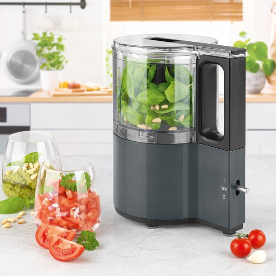 De ELEKTRISCHE VERTICALE HAKMOLEN is uitgevoerd met een razendsnel roterend edelstalen mes, dat dankzij de speciale uitvoering ook nog eens op en neer beweegt. Zo krijgt u met één druk op de knop en in een mum van tijd bijzonder constante resultaten. De hakmolen is heel gemakkelijk te bedienen: met slechts één schakelaar kiest u uit twee snelheidsinstellingen en schakelt u hem in of uit. Gemakkelijk schoon te maken, want het mes is uitneembaar. De mengbeker is bovendien net als de deksel vaatwasserbestendig. Antislipnoppen van rubber zorgen voor een veilig gebruik. 500 ml inhoud. Werkt op 230 V, 300 W. Afmetingen (l x b x h): ca. 14 x 19 x 22 cm. Ontdek nu de nieuwe manier van het verwerken van groente en fruit, ook in uw keuken.